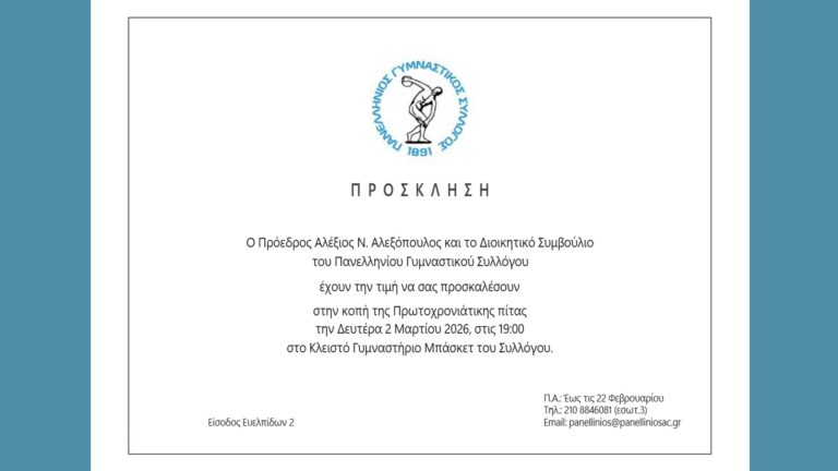O Πρόεδρος Αλέξιος Ν. Αλεξόπουλος και το Διοικητικό Συμβούλιο του Πανελληνίου Γυμναστικού Συλλόγου έχουν την τιμή να σας προσκαλέσουν στην καθιερωμένη εκδήλωση για την κοπή της Πρωτοχρονιάτικης βασιλόπιτας.