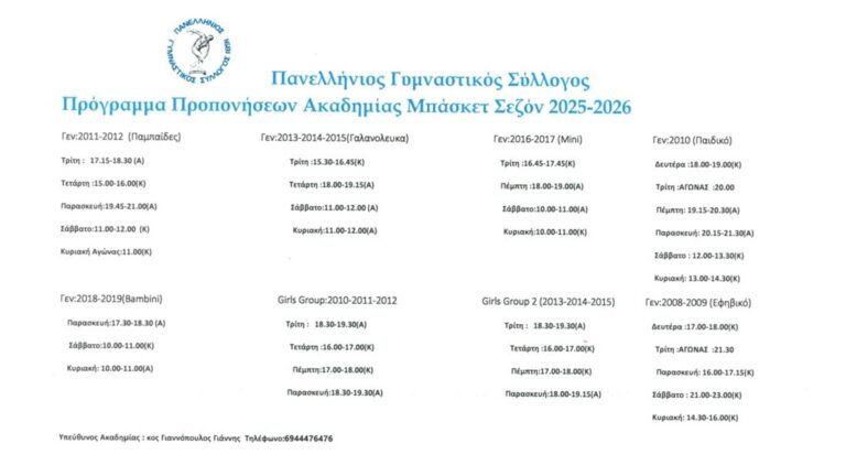 Ο Πανελλήνιος Γ. Σ. σας ενημερώνει για το ημερολόγιο πρόγραμμα των Ακαδημιών Μπάσκετ του Συλλόγου των Ολυμπιονικών που αναγράφεται στη φωτογραφία την οποία μπορείτε να δείτε σε μεγάλο μέγεθος στην σελίδα Facebook του Πανελληνίου.